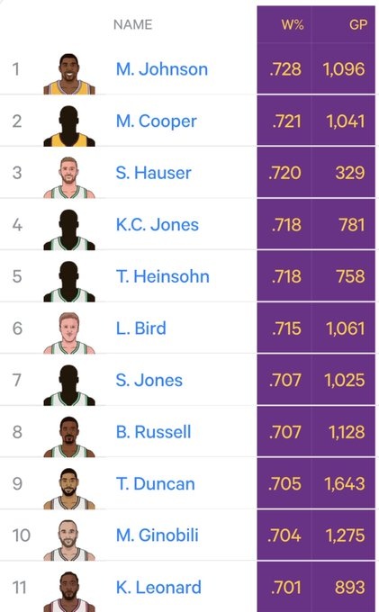 值得一提的是,小卡在加盟快船之前勝率425勝153負(含季后賽),勝率73.5%歷史第一,如今生涯戰(zhàn)績626勝268負,勝率70%,已經(jīng)跌出勝率前10。
