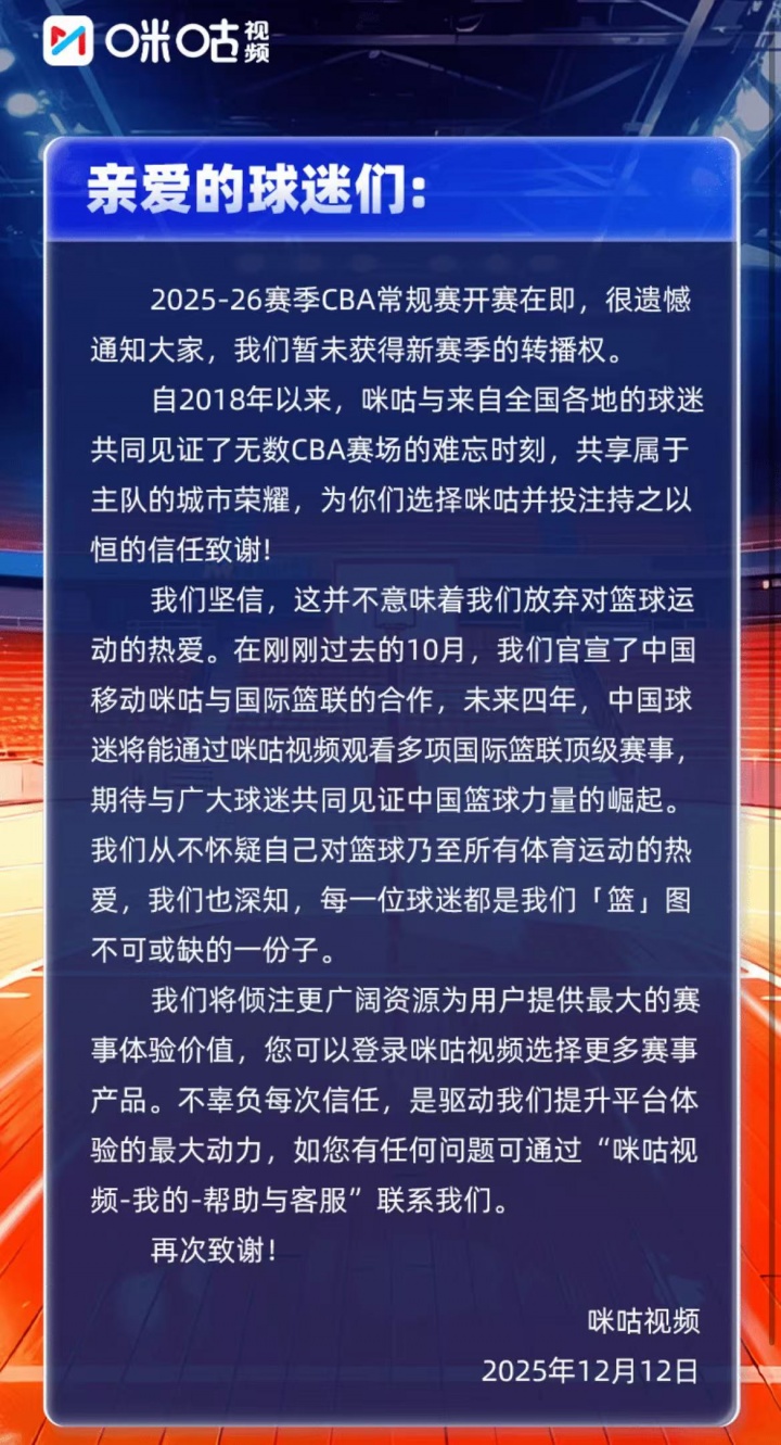 12月12日訊 咪咕官方發(fā)布公告致信球迷,宣布暫未獲得新賽季CBA聯(lián)賽賽事轉(zhuǎn)播權(quán)。