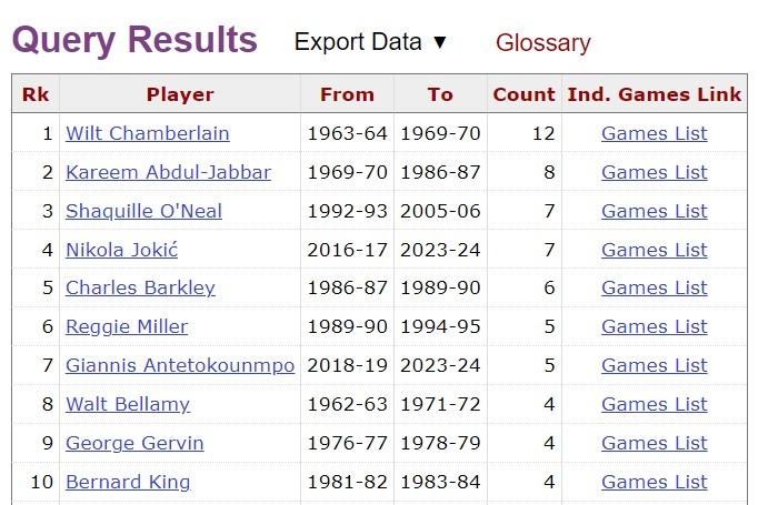 目前排在約基奇前面的是張伯倫,兩人相差4次。