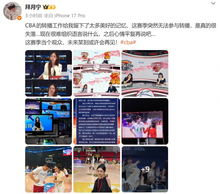 咪咕的美女主持人拜月寧發(fā)文談到了CBA的轉(zhuǎn)播工作,內(nèi)容如下: