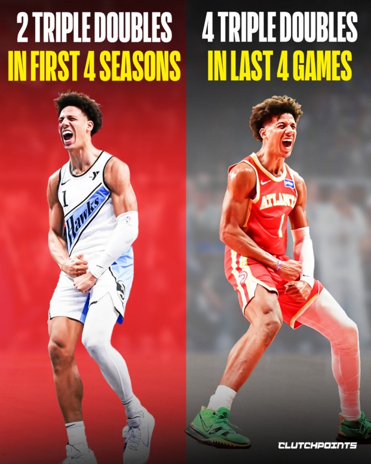 有意思的是,杰倫·約翰遜生涯一共拿到8次三雙,而他生涯前4個賽季才拿到過兩次。而本賽季就拿到了6次,其中更是包含這連續(xù)4場三雙。