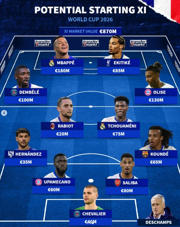 12月7日訊 德轉(zhuǎn)對法國在世界杯可能排出的首發(fā)陣容做出預(yù)算,其中姆巴佩、登貝萊等在列,具體如下: