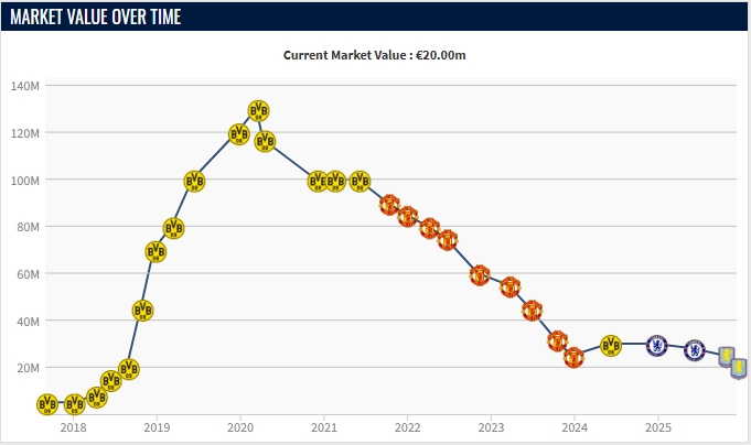 12月10日訊 英超身價昨日更新,曼聯(lián)租將桑喬身價再次下跌,現(xiàn)租借效力維拉的他還剩2000萬歐。