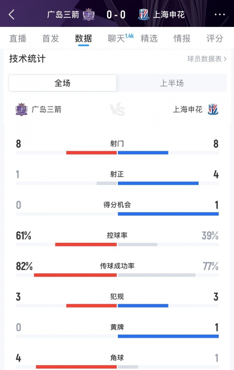 12月10日訊 亞冠精英聯(lián)賽東亞區(qū)第6輪,上海申花客場(chǎng)對(duì)陣廣島三箭,目前半場(chǎng)結(jié)束雙方0-0。半場(chǎng)兩隊(duì)數(shù)據(jù)如下(主隊(duì)廣島三箭在前):