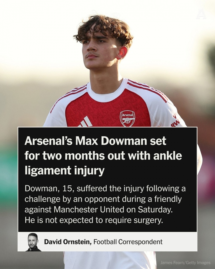 12月10日訊 據(jù)TA記者奧恩斯坦消息,15歲阿森納小將道曼腳踝韌帶受傷,將傷缺2個(gè)月。
