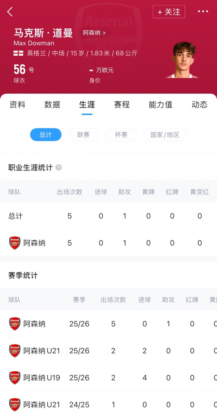 本賽季至今,道曼代表阿森納一線隊(duì)出戰(zhàn)5場(chǎng),送出過(guò)1次助攻。