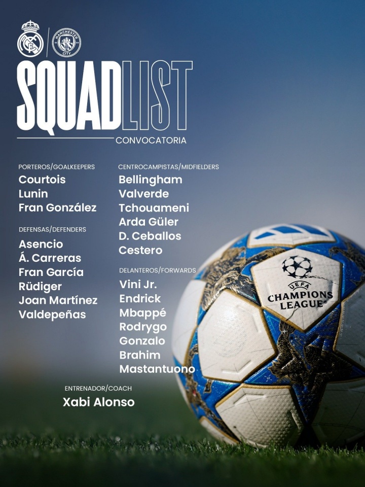 12月10日訊 北京時間12月11日凌晨4點,歐冠聯(lián)賽小組賽階段第6輪,皇馬坐鎮(zhèn)主場迎戰(zhàn)曼城,賽前皇馬公布本場比賽大名單。