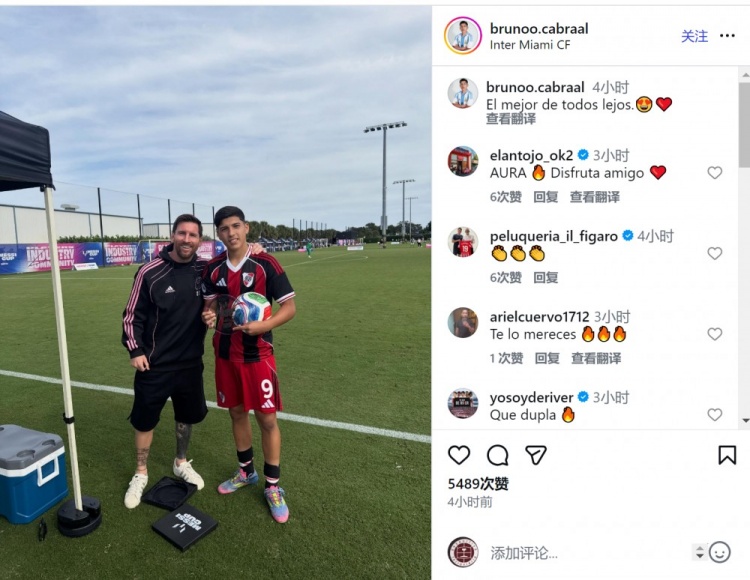 15歲的布魯諾·卡布拉爾在河床對(duì)陣國(guó)米的梅西杯比賽中戴帽,他當(dāng)選全場(chǎng)最佳球員,帶走比賽用球,并在賽后與梅西合影。